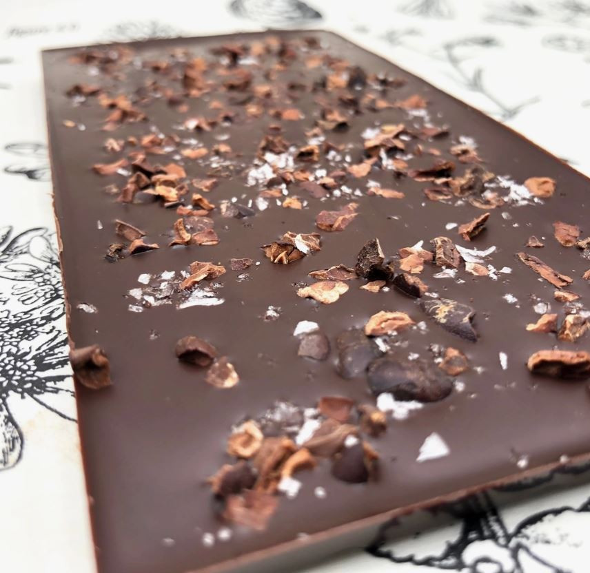 Smooth, bright 70% dark chocolate (blended origin, certified organic & fair trade) sprinkled with sustainably grown and house-roasted cacao nibs & Alaska Pure large flake sea salt. Bright, balanced, luscious.